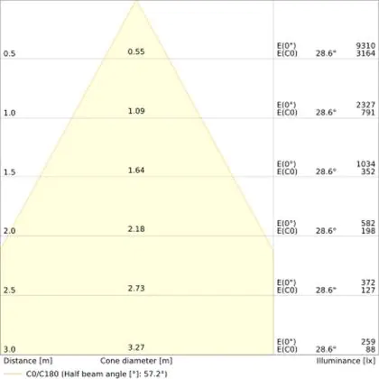 Der Abstrahlwinkel bezeichnet den Winkel, in dem das Licht aus der Lichtquelle ausgestrahlt wird. Er wird in Grad (D) angegeben. Je geringer die Gradzahl des Abstrahlwinkels ist, desto kleiner ist auch der Durchmesser des Lichtkegels, den die Lichtquelle produziert.