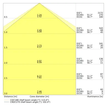 Le code couleur se compose de l'indice de rendu des couleurs (IRC) et de la température de couleur (Kelvin). Le premier chiffre indique le rendu des couleurs (1 = très mauvais rendu des couleurs, 9 = meilleure authenticité des couleurs). Le deuxième et troisième chiffre indiquent la température de la couleur. Exemple : Le code couleur "830" indique que la lampe a un bon rendu des couleurs (8) et une couleur de lumière blanche chaude (30 = 3000K). |