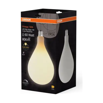 Cette ampoule Osram Vintage 1906 LED Big Grape E27 Filament Dépolie 7.3W 806lm - 827 | Dimmable - Remplacement 60W avec son efficacité lumineuse de lumen par watt vous permettra de profiter d’un éclairage de qualité. Avec sa durée de vie de 15000 heures, vous n’aurez pas à vous soucier de son remplacement avant quelques années.